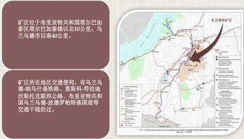 位于布里亚特共和国南部扎卡缅斯克区,沿俄蒙边境延伸。扎卡缅斯克是该区中心城市(这两个矿区位于该市附近),与乌兰乌德市(450公里)和最近的火车站吉达站(240公里)之间均有公路相连。